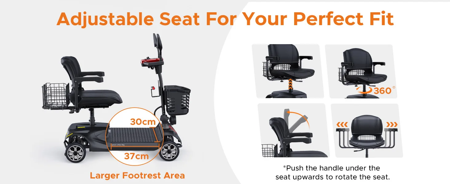 Foldable & Adjustable Design — Easily fold your scooter for storage or transport, and adjust the seat and tiller to customize your comfort.