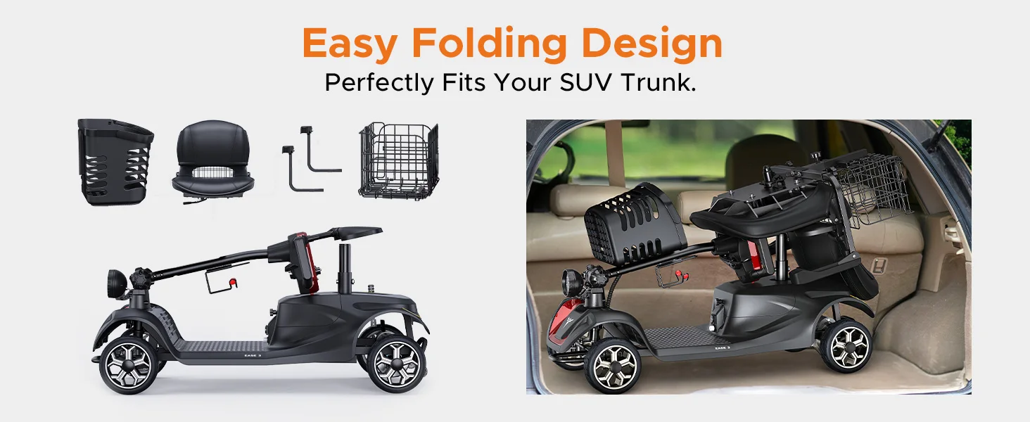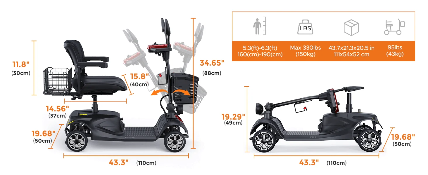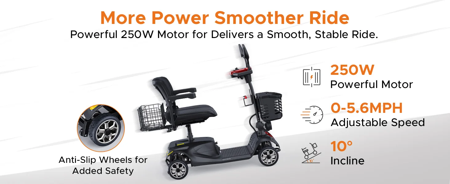 Experien comfort, safety, and convenien with our Latest 4-Wheel Mobility Scooter. Equipped with a Powerful 250W Motor and a 24V 12AH Battery, it reaches speeds of up to 5.6MPH and handles inclines up to 10°. Solid 8"x3" Anti-Slip Tires ensure stability, while Rearview Mirrors enhan safety. Enjoy ample storage with Front and Rear Baskets, plus a handy Cup Holder. Its Adjustable, Foldable Design makes it Easy to Control — perfect for travel or daily errands.