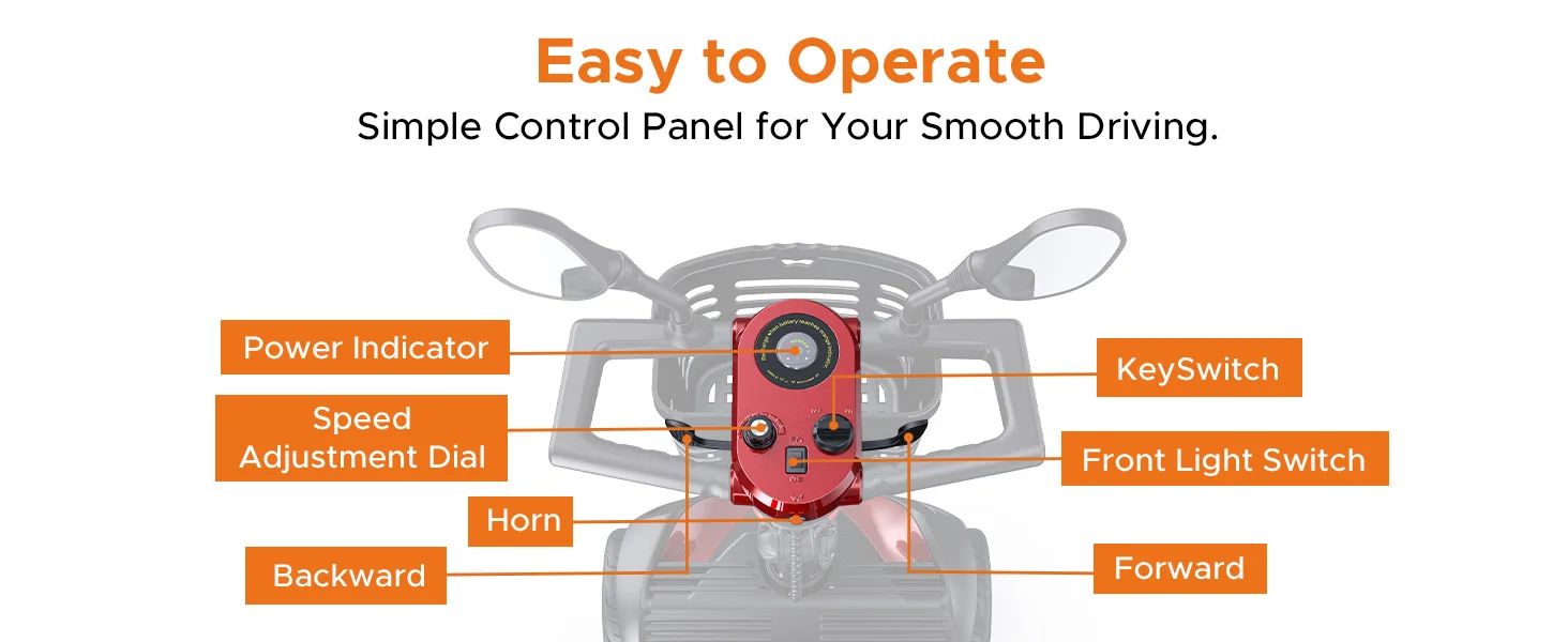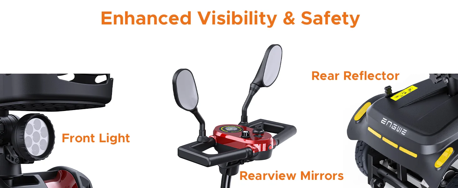 Rearview Mirrors for Safer Travel — Navigate with confiden in crowded spas, parking lots, or along busy walkways with clear rearview mirrors for enhand visibility.